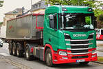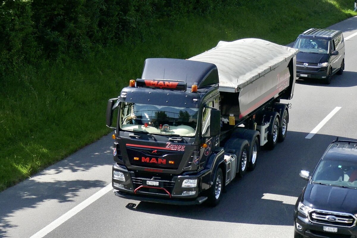 Ein MAN Kippersattelzug von Zaugg Belp AG der am 28.6.24 auf dem Weg zum Trucker Festival ist auf der A8 in Matten bei Interlaken.