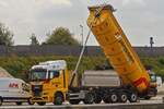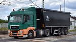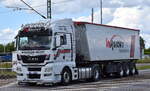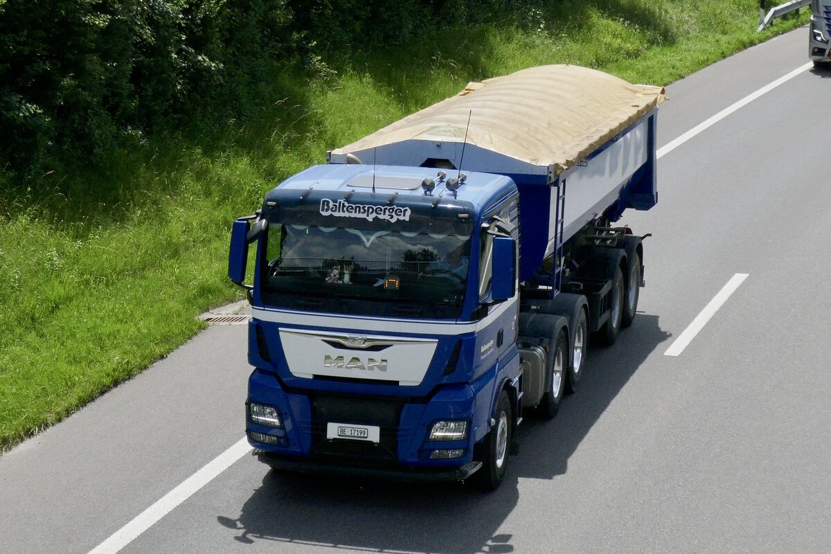 Ein MAN Kippersattelzug von Baltensperger der am 28.6.24 unterwegs zum Trucker Festival ist auf der A8 in Matten b. Interlaken.