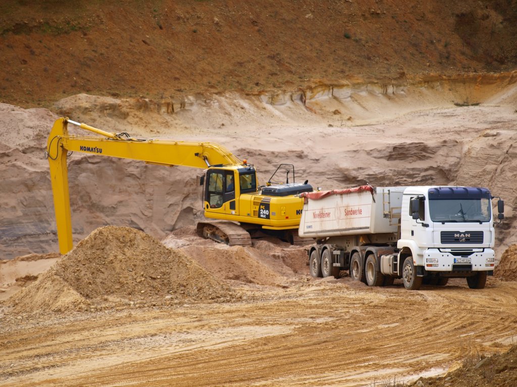 Ein Komatsu Bagger PC 240 NLC in einer Kiesgrube in Herzogenrath bei Aachen beim beladen eines MAN LKW.