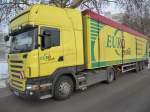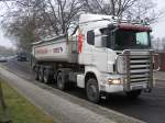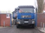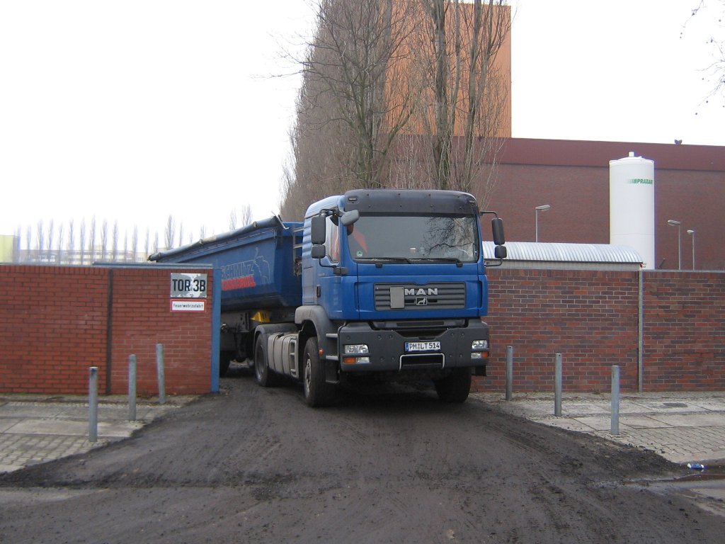 MAN TGA 18.410 mit Kippsattelauflieger vom Hersteller Schmitz verläßt am 24.02.2009 eine Baustelle in Berlin-Charlottenburg