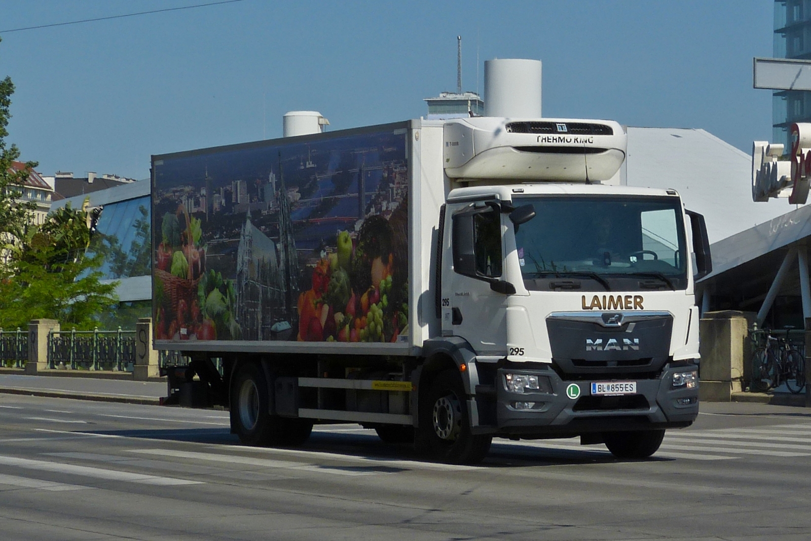 MAN Kühllaster von Laimer, in den Straßen von Wien unterwegs. 06.2023
