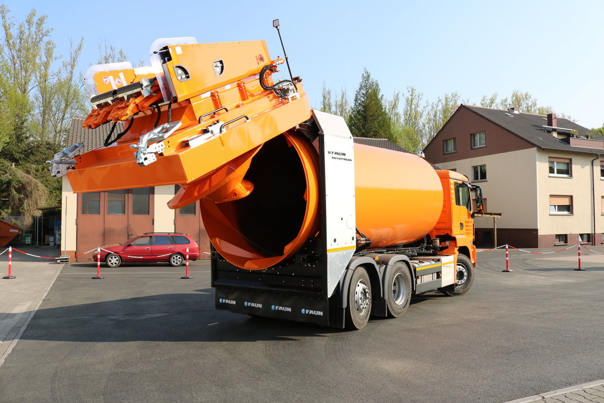 Brandneuer Max Spahn und Sohn KG MAN TGS 26.320 mit geöffneten Faun Rotopress Aufbau am 21.04.18 in Maintal bei einen Fototermin