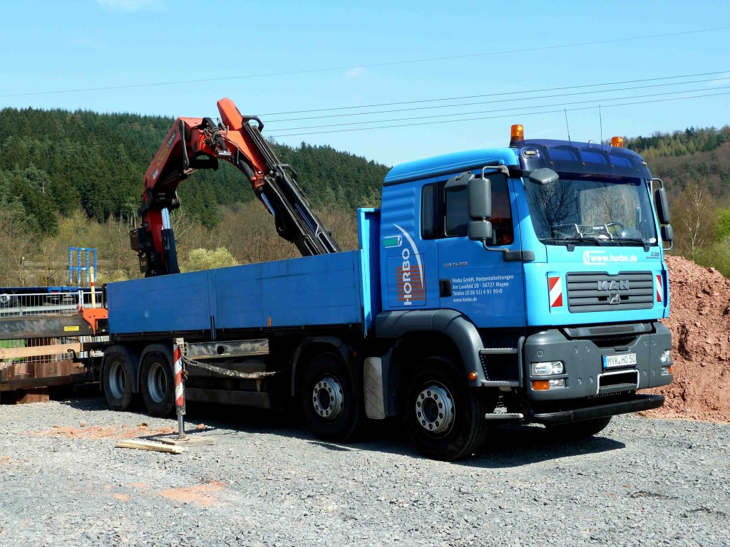MAN TGA 35.480 mit Ladekran steht an der Laugenleitungsbaustelle der Firma K&S in der Gemarkung von 36100 Petersberg-Marbach, April 2013