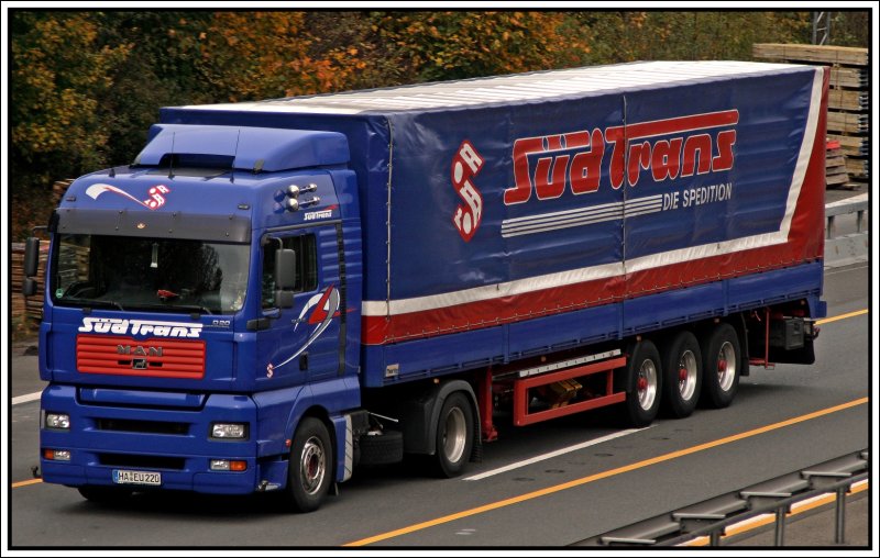 Südtrans rollt Richtung Süden: MAN TGA 18.430 D20 CommonRail der Spediton SüdTrans aus Hagen ist bei Lüdenscheid unterwegs. Aufgenommen am 22.10.2008. Wie der Name schon sagt rollt SüdTrans hauptsächlich in Richtung Süddeutschland.