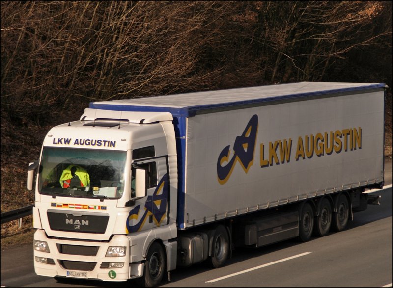 LKW AUGUSTIN.. Wir bewegen gut und güter!: MAN TGX 18.440 der großen Spedition LKW AUGUSTIN ist durch das Sauerland unterwegs. Vor mehr als 30 Jahren wurde die Spedition von der Familie Augustin gegründet. Hauptsitz ist in Straßwalchen/Linz. Das Unternehmen besitzt Standorte in Deutschland, Tschechien, Ungarn, Italien und Spanien. Das Unternehmen setzt über 1000 Lkws, MAN und Actros, ein. Neu ist auch das Erscheinungsbild. Nun wird die Flotte in Weiß unterwegs sein.