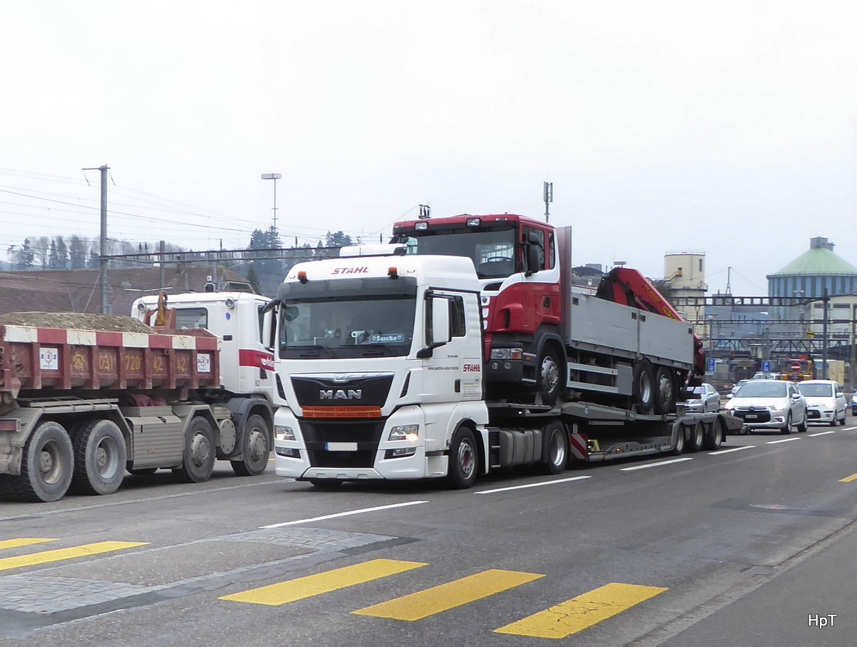 MAN Sattelschlepper mit Scania LKW als Ladung unterwegs in Aarberg am 15.03.2018