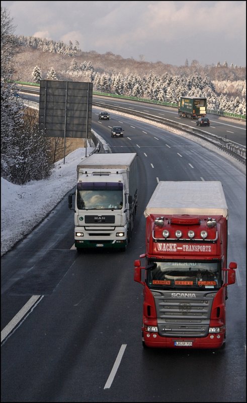 SCHWEDEN POWER: Scania R500 \8/ der Nacke-Transporte zieht an einem italienischen MAN TGA vorbei. (12.02.2009)