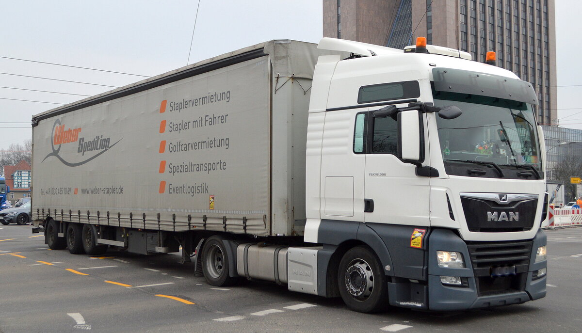 Weber Spedition mit einem Sattelzug mit MAN TGX 18.500 Zugmaschine am 17.03.22 Berlin Marzahn.