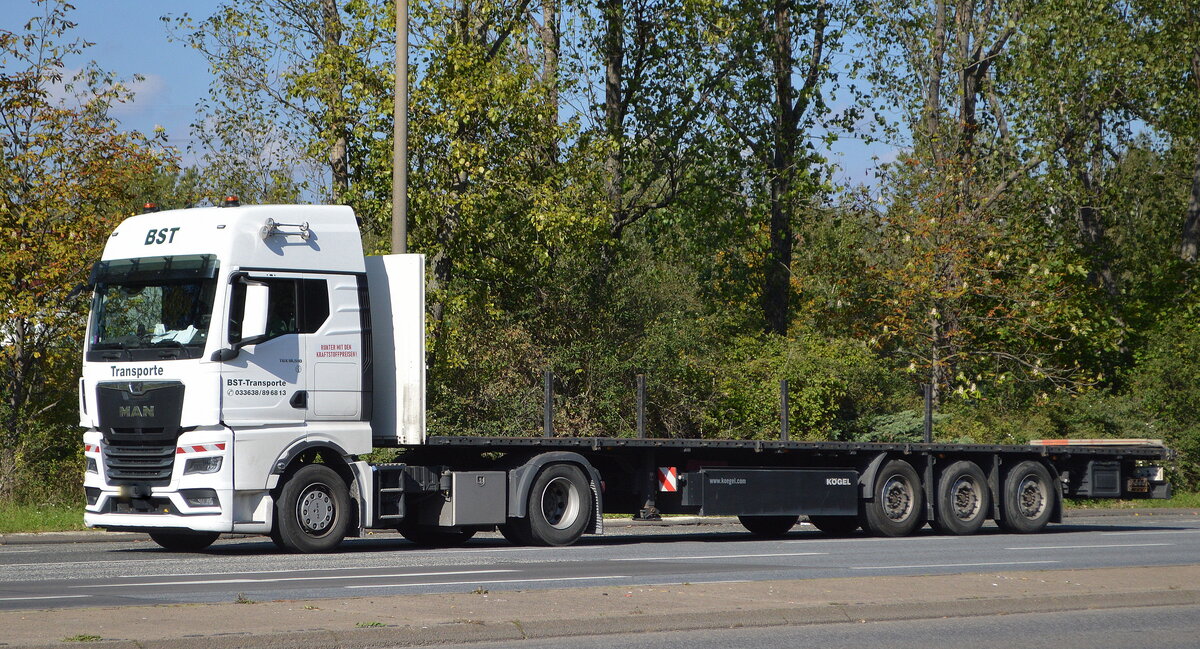 BST-Transporte mit einem Sattelzug mit MAN TGX 18.510 Zugmaschine am 30.09.22 Berlin Marzahn.