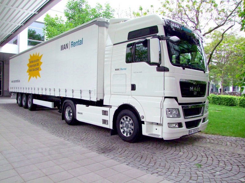 MAN_TGX18.680(Rental) ist zwischen zwei Hallen in München anlällich der TransportLogistic ausgestellt; 090515