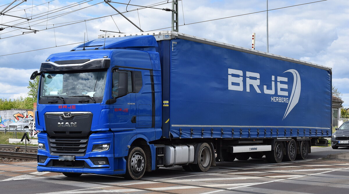BRJE Herberg Transport i Spedycja aus Polen mit einem Sattelzug mit MAN TGX 18.470 Zugmaschine am 18.04.24 Höhe Bahnübergang Bahnhof Rodleben.