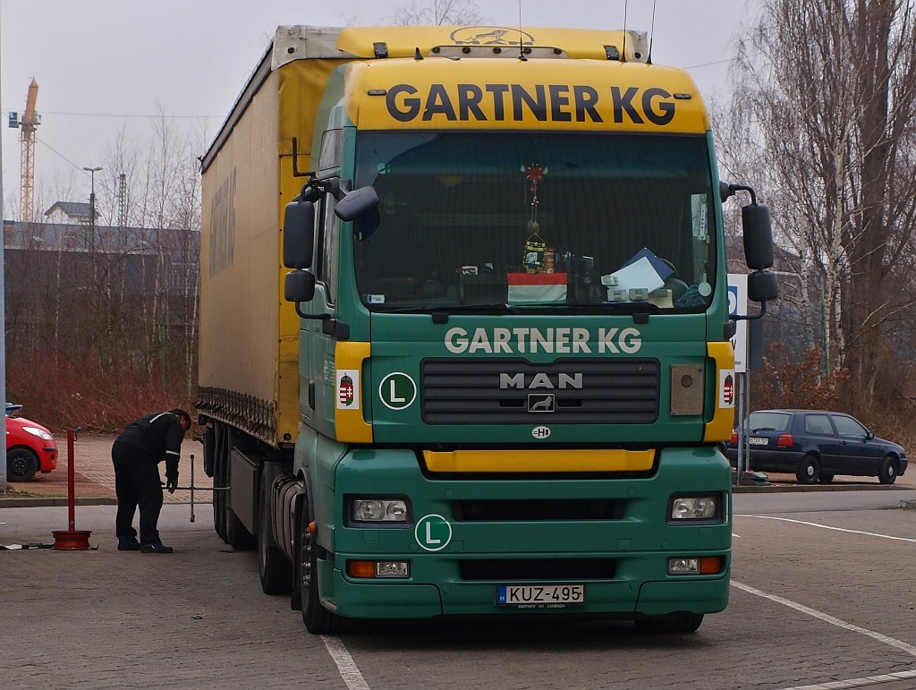 Gesehen am 18.02.2011 auf dem Parkplatz vor dem Continentalwerk in Aachen. MAN TGA 18.440 mit Planenauflieger und Reifenpanne.