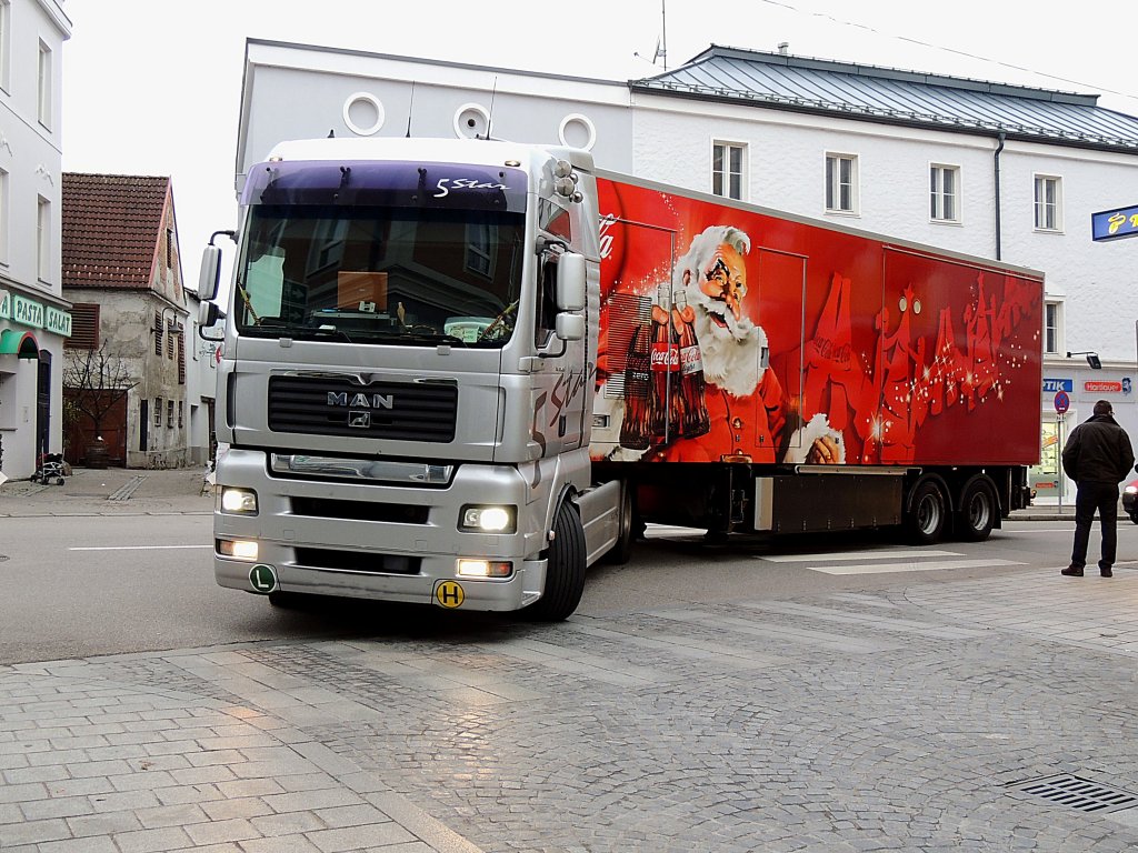 MAN TGA18.480 5Star, erreicht mit dem COCA-COLA Bühnen-Auflieger seinen Zwischenstop Ried i.I.; 121124