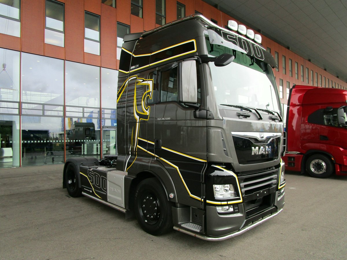 MAN TGX 18.500 EvoLion Sattelzugmaschine am 26.09.2019 vor der Messe Karlsruhe.