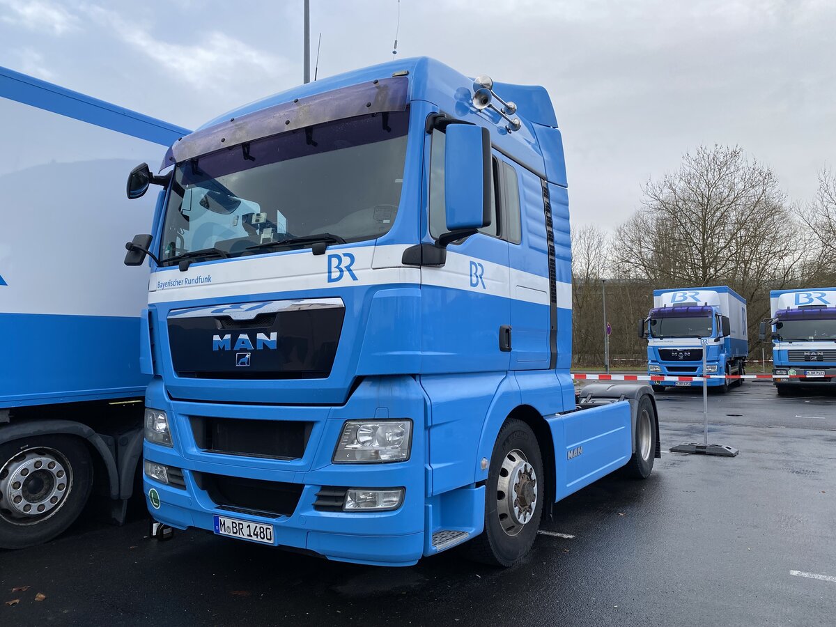 MAN TGX des Bayerischen Rundfunks in Veitshöchheim (Unterfranken). Zum Aufnahmezeitpunkt (Feb. 2022) fanden dort die Dreharbeiten zu der BR-Sendung "Fastnacht in Franken", übrigens die erfolgreichste Sendung des BR, statt.