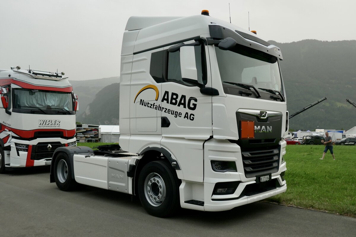 Eine MAN Zugmaschine von ABAG Nutzfahrzeuge die am 29.6.24 beim Trucker Featival Interlaken steht.
