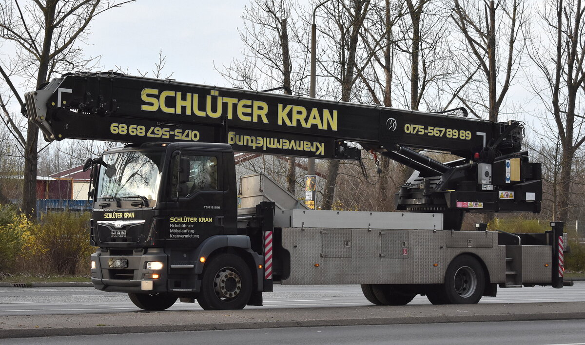Mike Schlüter - Hebebühnenmietservice/ SCHLÜTER KRAN mit einem MAN TGM 18.290 mit ausfahrbarem Teleskoparm am 12.03.24 Berlin Marzahn.