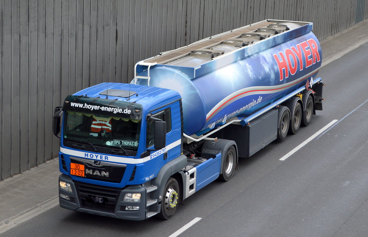 Hoyer Unternehmensgruppe mit einem Tank-Sattelzug mit MAN Zugmaschine (UN-Nr.: 30/1202 = Dieselkraftstoff oder Gasöl oder Heizöl (leicht)) am 26.04.21 Berliner Stadtautobahn Höhe Knobelsdorffbrücke.