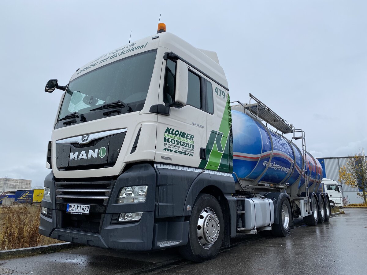 MAN TGS18.510 samt Tanksattelauflieger, ist zur Entladung einiger Kesselwaggons am Bhf.Ried eingeteilt; 250317