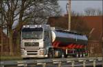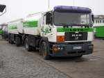 MAN TGS18.510 samt Tanksattelauflieger, ist zur Entladung einiger Kesselwaggons am Bhf.Ried eingeteilt; 250317
