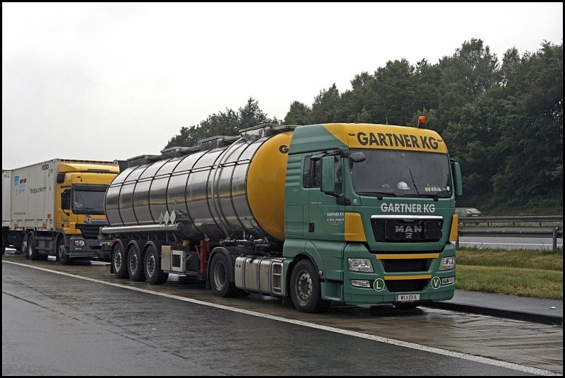 GARTNER Special No3: MAN TGX 18.440XLX von GARTNER KG aus Lambach muss mit seinem Tankauflieger den Feiertag auf einem Parkplatz an der A45 verbringen. Was bedeutet das V?