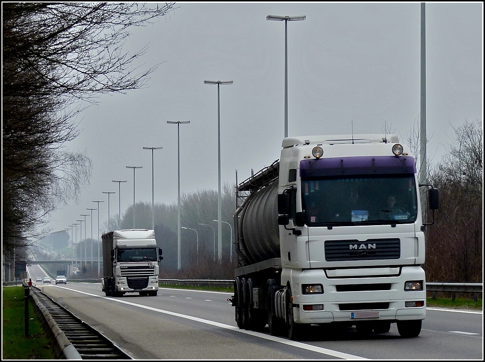 Ein MAN und ein DAF Sattelzug allein auf weiter Flur auf der Autobahn zwischen Lüttich und Hasselt am 09.03.2011.