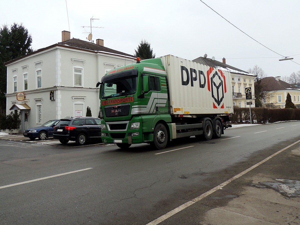 MAN TGX26.400; transportiert einen DPD-Wechselaufbau in der Rieder Bahnhofstraße in Richtung nächstem Empfänger; 150206