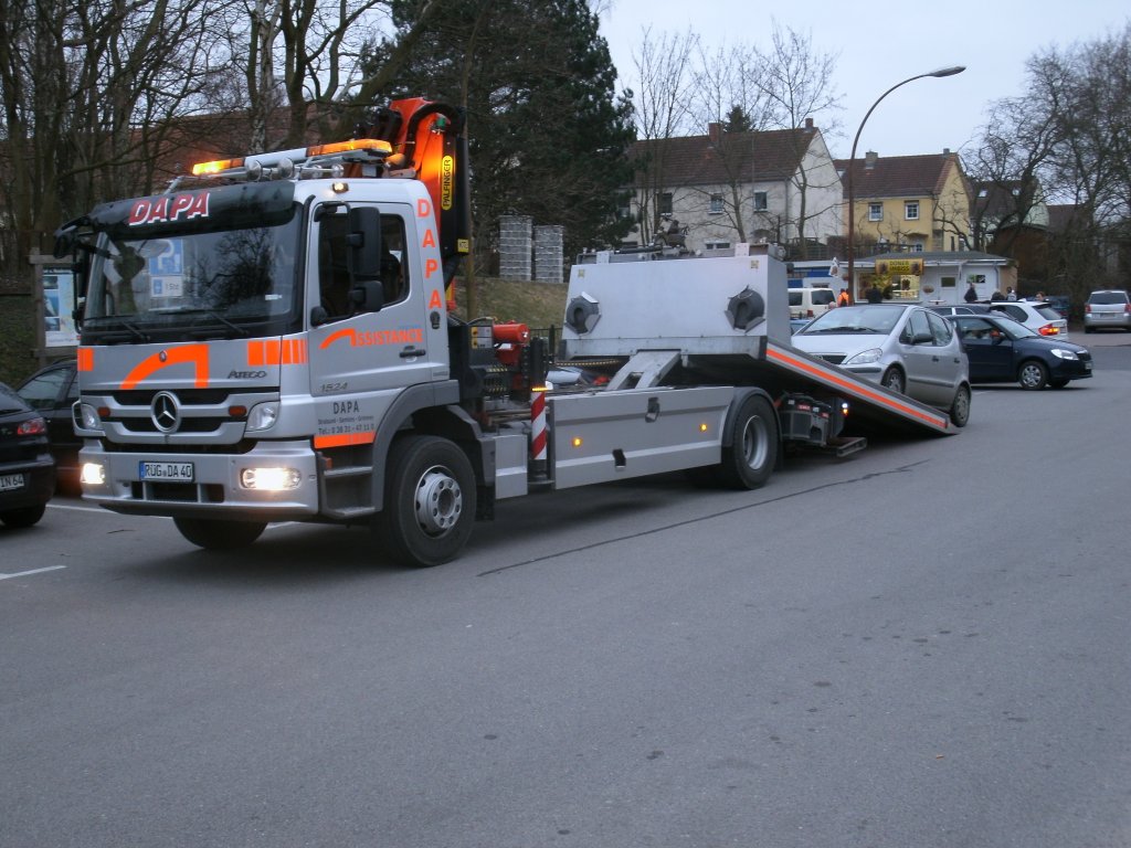 Einsatz für Diesen Mercedes Abschlepper der,am 15.März 2012,einen defekten Babybenz (Mercedes A-Klasse)vor dem Bahnhof in Bergen/Rügen abholte.