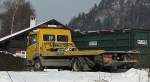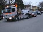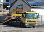 M-B Atego Abschleppfahrzeug des Luxemburger Auomobilklubs lädt ein Fahrzeug bei einer Autowerkstatt ab. 15.03.2012.