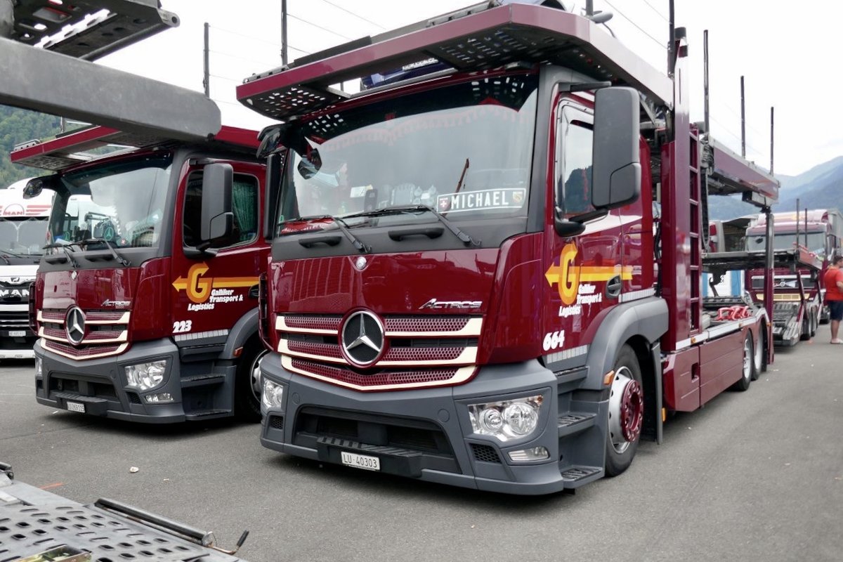 Zwei MB Actros Autotransporter von Galliker am 25.6.18 beim Trucker Festival Interlaken.