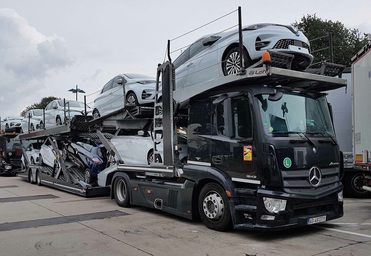 =MB Actros-Autotransporter steht auf einer Rastanlage an der A 3, 08-2021