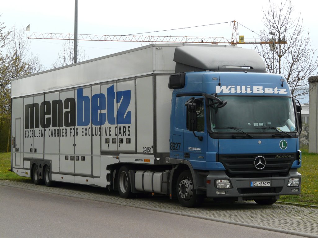 MB Actros MP2 1844 mit einem Auflieger für den Transport von hochwertigen Fahrzeugen von "Willi Betz" abgestellt in Schwäbisch Hall, 22.04.2012