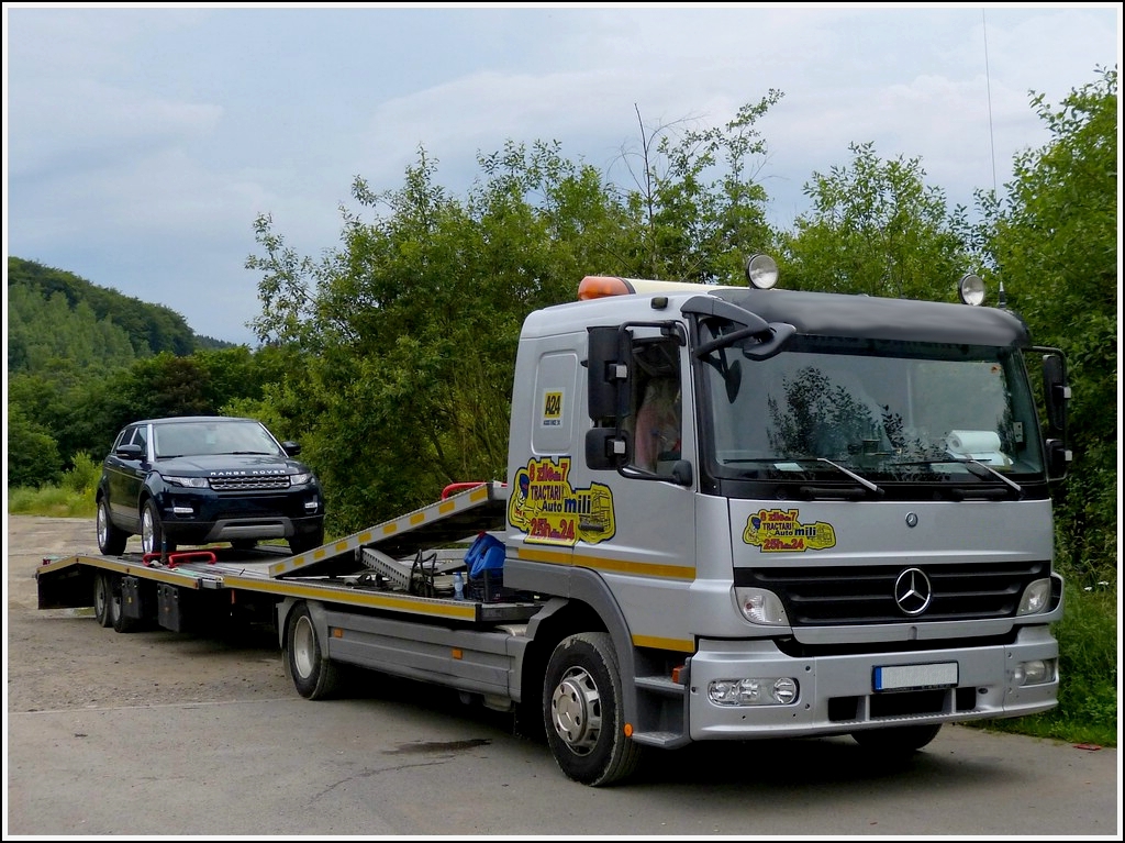 Diesen M-B Atego Autotransporter stand am 05.07.2012 beladen mit einem Neuwagen am Straßenrand.