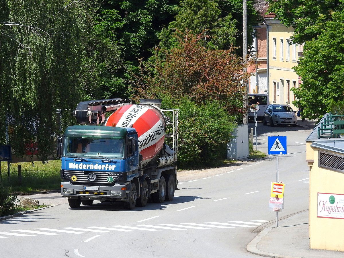ACTROS-4140 ist mit drehender Mischtrommel am Weg zur nächsten Baustelle; 160627