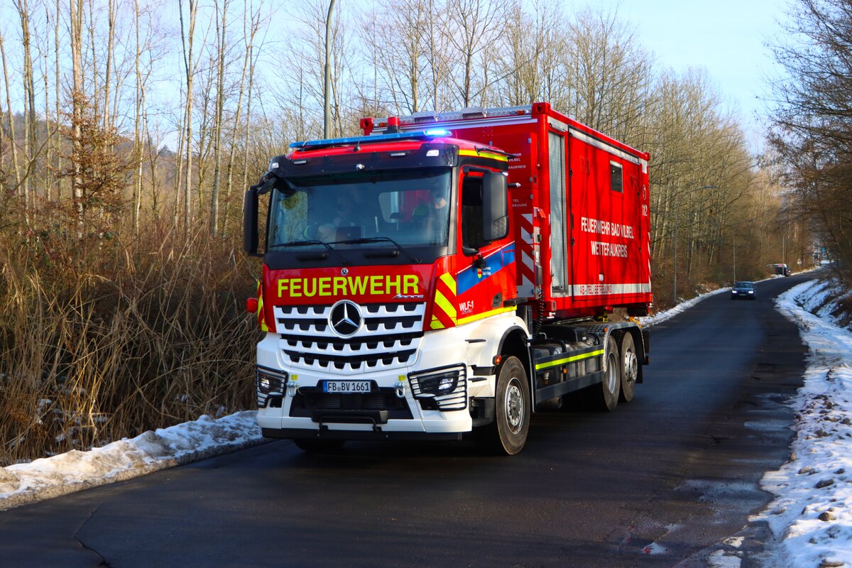 Feuerwehr Bad Vilbel Mercedes Benz Arocs 2542 mit AB-TEL/Betreuung beim Abrücken am 31.01.26 nach einer Großübung in Büdinger Gewerbegebiet Daniel Oster