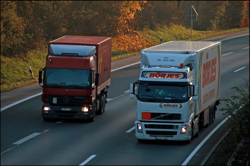Ein Volvo FH, vermutlich mit 480 PS, lässt einen Actros einscheren. (04.11.2008)