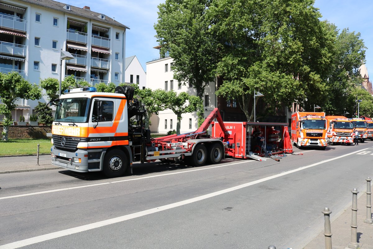 Feuerwehr Frankfurt am Main Mercedes Benz Actros WLF mit AB-SLM am 01.06.19 beim Tag der Sicherheit in Frankfurt am Main