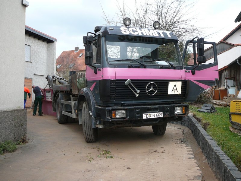 MB 1735 der Entsorgungsfirma Schmitt holt den gefüllten Container von einer Baustelle in 36100 Petersberg-Marbach, 09.04.09