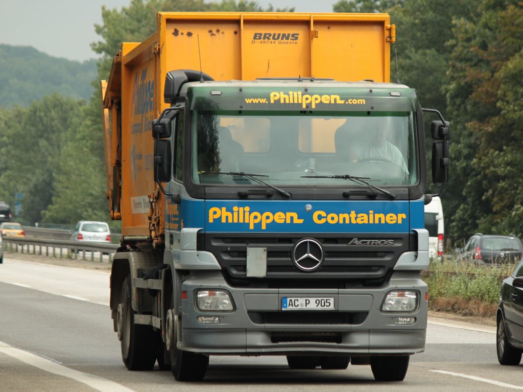 Mercedes Actros mit Presscontainer am 26.07.2011 auf der A4 kurz vor der Niederländischen Grenze.