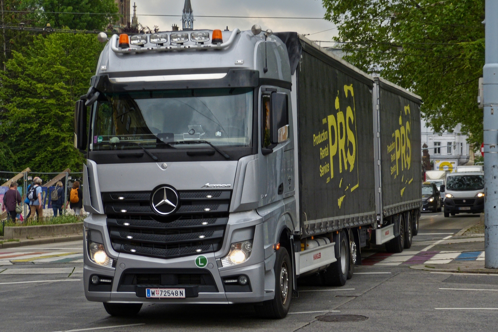 Mercedes Benz Actros, Hängerzug, gesehen in den Straßen von Wien. 06.2023