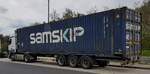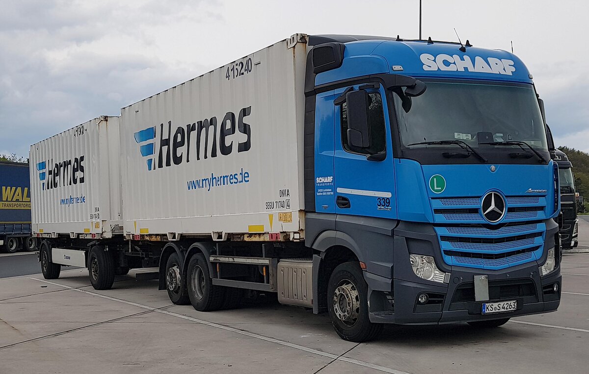 =MB Actros-Hängerzug der Spedition SCHARF ist unterwegs für Hermes, 04-2023