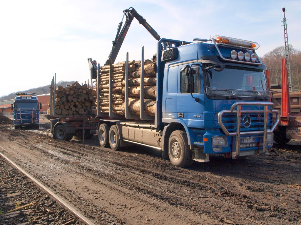 Actros 3355 Holztransporter als Hängerzug mit Ladekran und im Hintergrund Actros 3354 Sattelauflieger beim beladen von Waggons in Stolberg am 24.03.2010.
