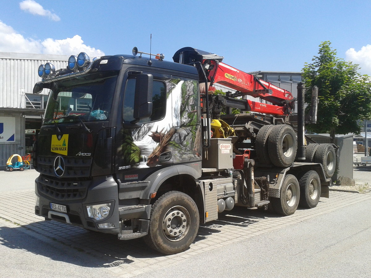 Mercedes Arocs 2651 Holztransporter auf einem Baumarkt-Parkplatz in Regen. 24.06.206