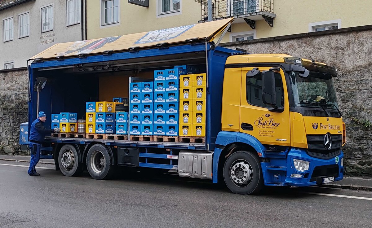 =MB von der POST BRAUEREI WEILER steht im Dezember 2023 zur Getränkeanlieferung in Lindau