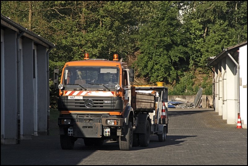 Mercedes-Benz SK 1831 mit fahrbarer Absperrtafel am Morgen des 02.06.2009 auf dem Platz der AM Lüdenscheid.