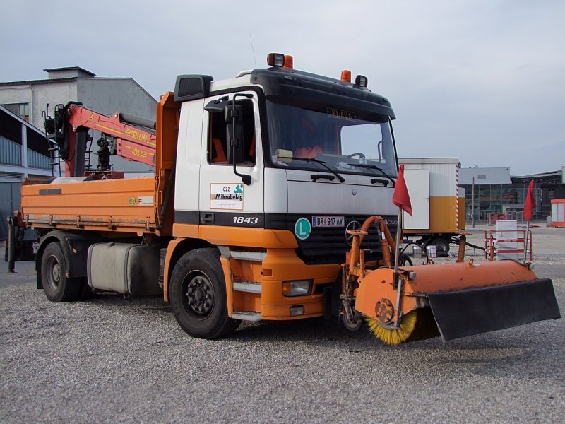ACTROS1843 als "Multifunktionsfahrzeug" mit aufgebautem Kran incl. Schaufel, sowie an der Front eine Kehrmaschine; 090817