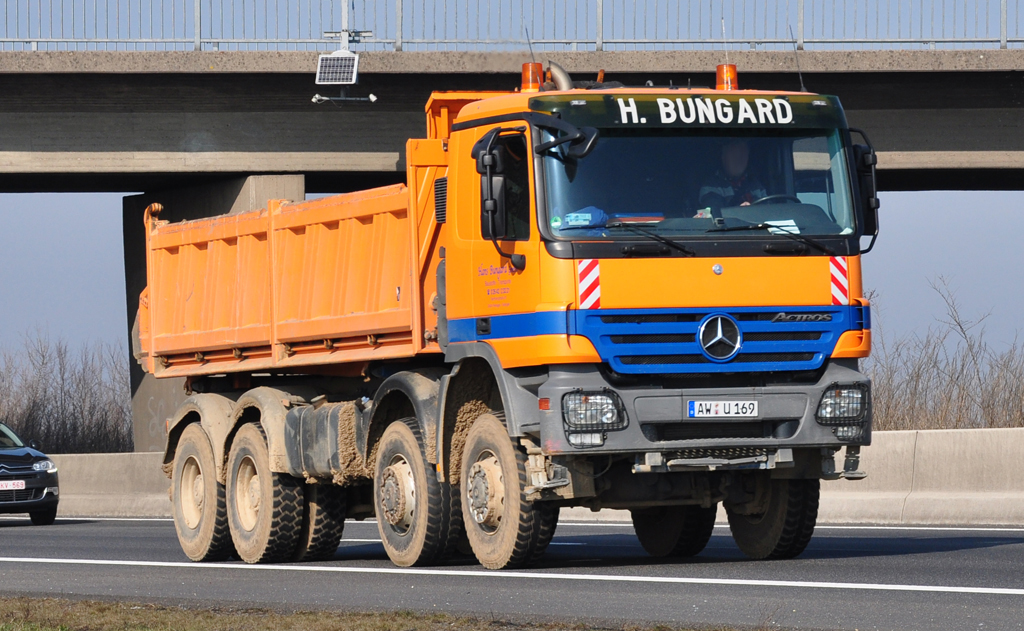 MB Actros 4-achs-Kipper "H. Bungard", auf der A61 bei Miel - 04.03.2011