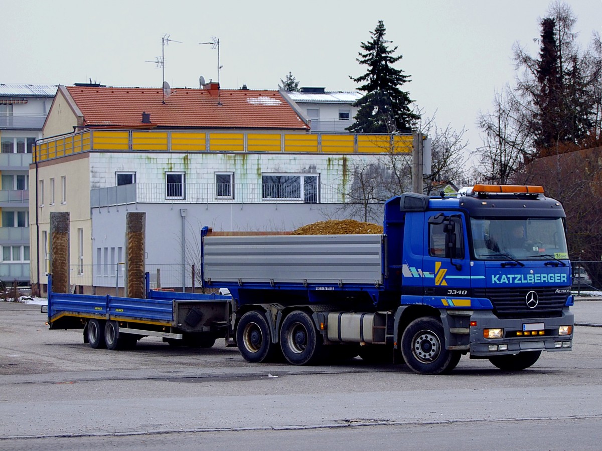 ACTROS-3340, beladen mit Schotter, zieht einen kleinen Tiefladehänger hinter sich her; 130402