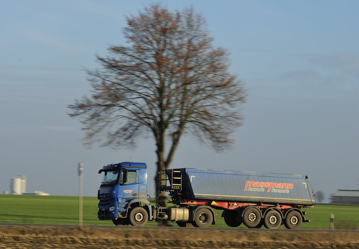 Mercedes-Benz Actros 1848 mit Kipperauflieger, mitgezogen am 6.2.2017 auf der L 164 (ex B221) bei Übach - Palenberg