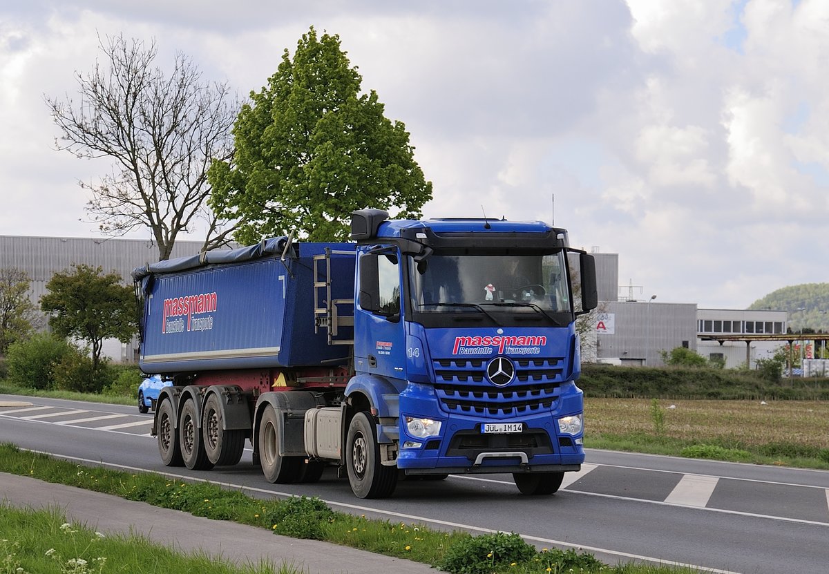 Mercedes-Bens Actros Kippersattelzug am 27.4.2017 auf der L 164 (ex B221) bei Übach - Palenberg